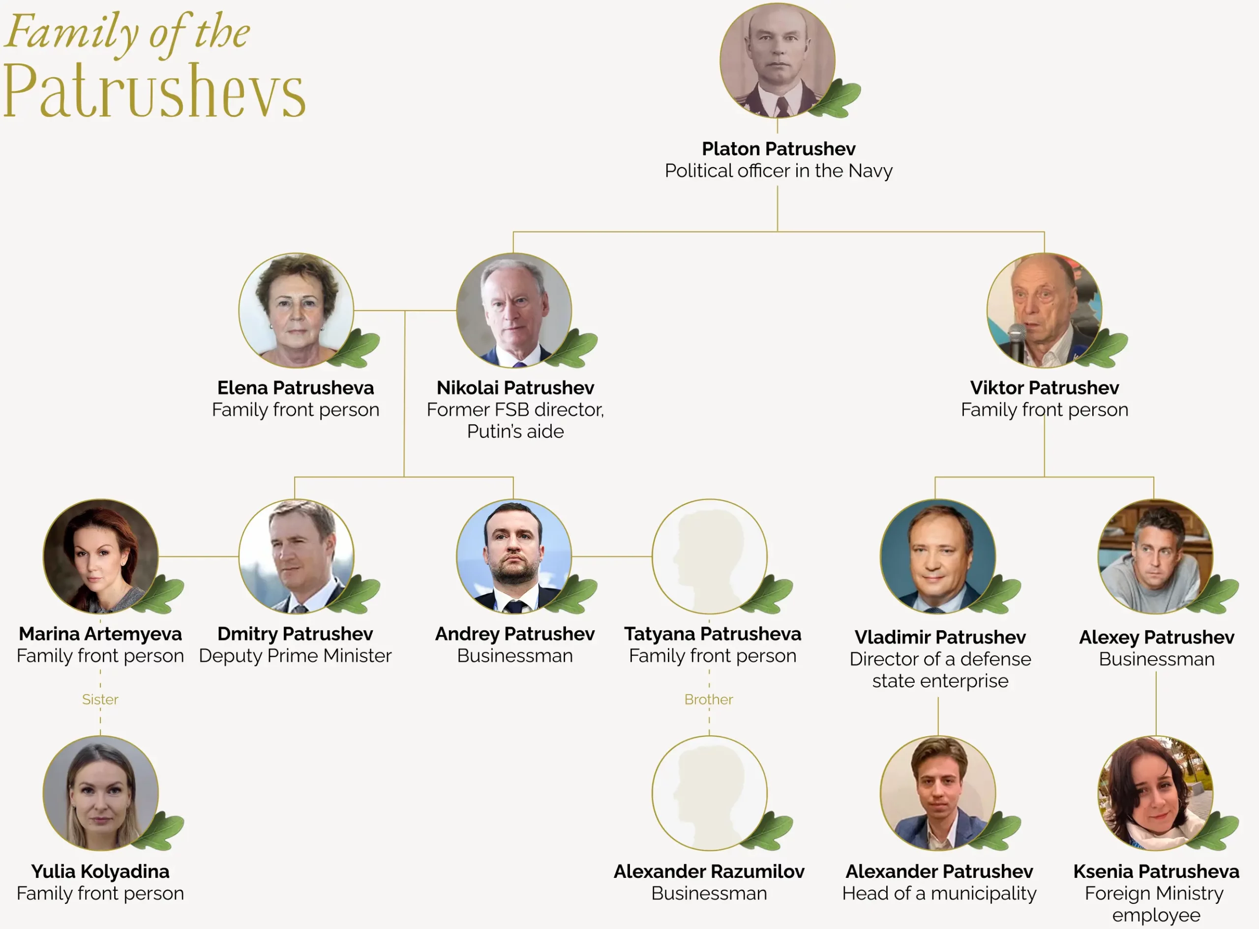 Nikolai, Dmitry, Andrei, Viktor, Alexei and Vladimir Patrushev, as well as their numerous household members