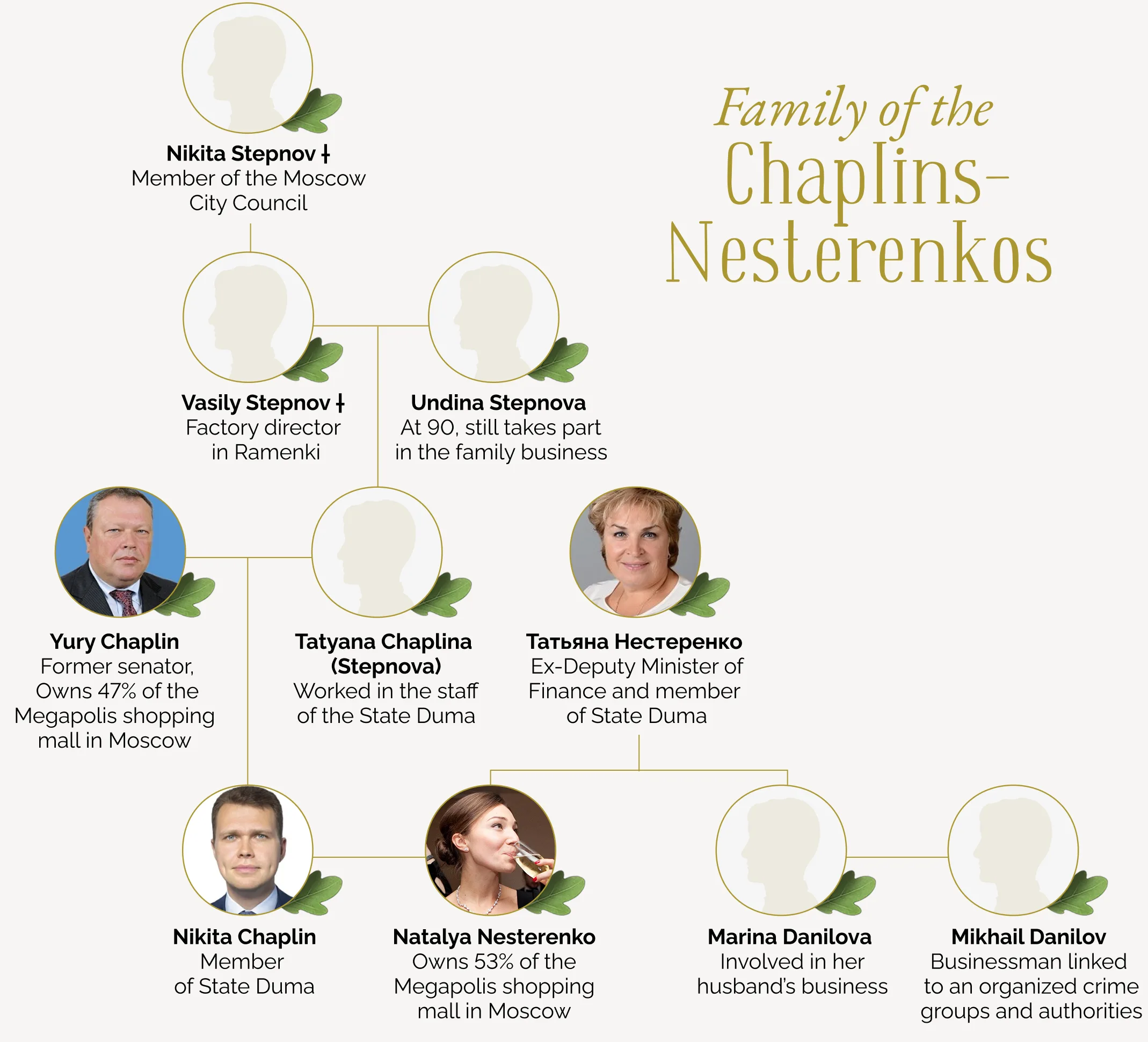 Using their official positions for family gain is a trait shared by the entire Chaplin-Nesterenko family. Their main source of enrichment is the Moscow Oblast, which the young MP represents in parliament and whose prosperity he is supposed to ensure. In the early 2010s, when Nikita was a member of the Moscow Oblast Duma and his father was a senator, Boris Gromov, then governor of the Moscow Oblast, made 1,500 hectares of the Rublyovsky Forest parts of nearby settlements. This opened up lots of money-making opportunities for the Chaplins, because the decision meant that now the right people could use the super expensive, if not priceless, land on Rublyovka for development. Here’s how it worked: companies registered under the name of the MP’s elderly grandmother, Undina Ilyinichna Stepnova