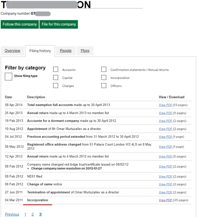Нажав на нужную фамилию мы обнаружим, что наш герой владеет компанией, а внутри карточки этой компании во вкладке Filling history можно найти документ Incorporation.