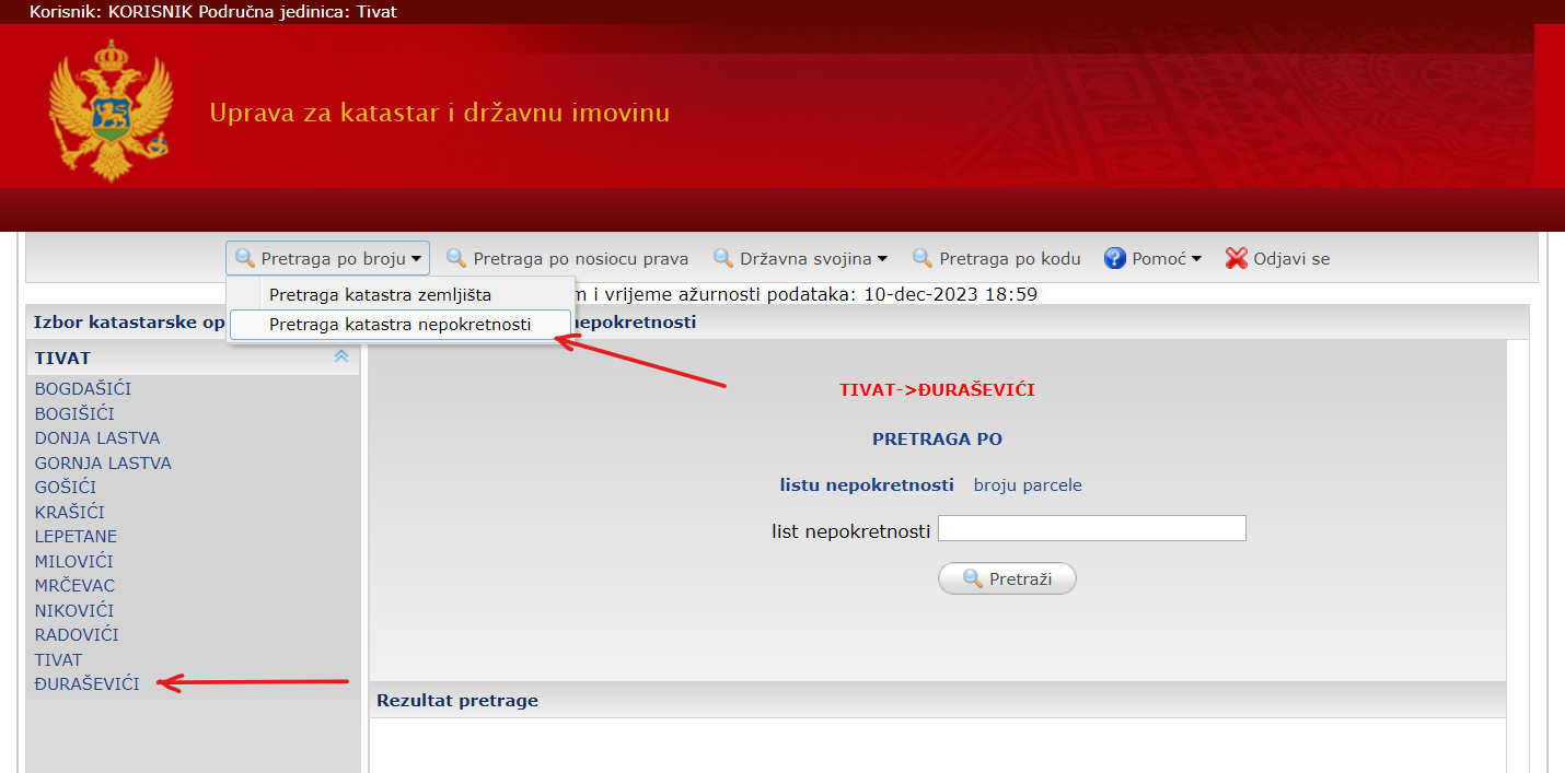 Далее во вкладке «Pretraga po broju» (поиск по номеру) выбираем «Pretraga katastra nepokretnosti» (поиск по кадастровому номеру недвижимости). В меню слева выбираем нужную нам территорию (Đuraševići)
