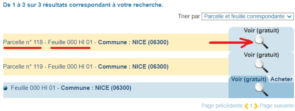 3. После нажатия кнопки «Rechercher» сайт выдаст нам результаты поиска, удовлетворяющие условиям, которые нам пригодятся для составления запроса. Можно посмотреть бесплатно найденные участки на карте, нажав на соответствующий значок лупы, но нам важнее запомнить номер участка (в данном случае 118) и номер кадастровой записи (000 HI 01).