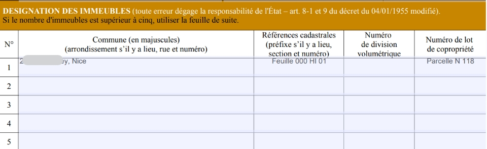 - Если вы, наоборот, ищете не недвижимость, а владельца определенной виллы, то вам вместо предыдущего раздела нужно заполнить раздел DESIGNATION DES IMMEUBLES (описание недвижимости). В столбце Commune указываем коммуну и, если применимо, — район, улицу и номер дома. В столбце «Références cadastrales» (кадастровые данные) указываем техническую информацию, полученную из кадастровой карты. В столбце «Numéro de lot de copropriété» пишем номер участка.