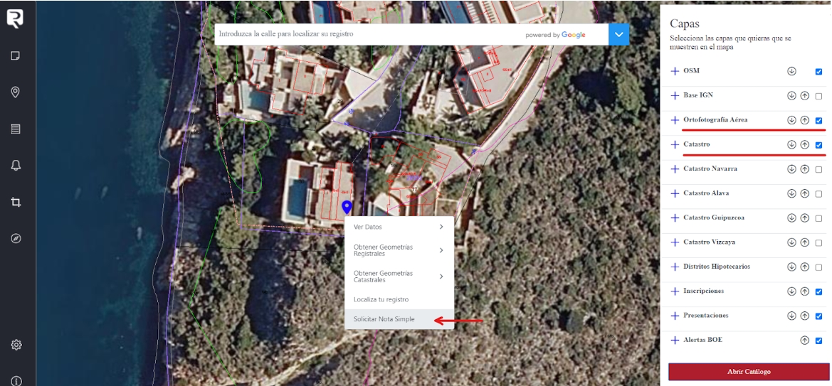Здесь можно ввести адрес как в Google Maps и найти нужный дом. Для удобства можно нажать на кнопку слоев и выбрать пункты «Ortofotografía Aérea» (спутниковые снимки) и «Catastro», чтобы видеть кадастровые границы. После этого нажать на нужный объект правой клавишей мыши и выбрать «Solicitar Nota Simple».