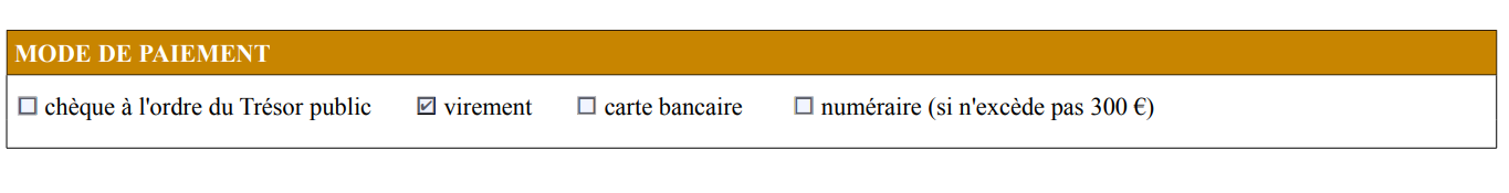 В графе «MODE DE PAIEMENT» (Способ оплаты) выбираем «virement» (банковский перевод) или «carte bancaire» (банковская карта) в зависимости от доступных способов оплаты.