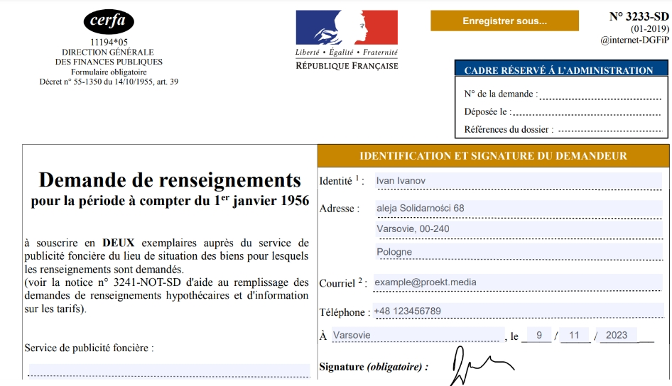- IDENTIFICATION ET SIGNATURE DU DEMANDEUR (Идентификация и подпись заявителя). В этом разделе в поле Identité нужно указать ваши имя и фамилию, либо название организации. Дальше заполняем адрес (Adresse), email (Courriel), телефон (Téléphone), а также место и дату заполнения (À, le). Не забудьте поставить подпись (Signature), которая является обязательной. К сожалению, мы не знаем, могут ли после 2022 года возникнуть проблемы у заявителей, которые укажут в этом разделе российский адрес. Рекомендуем при возможности заполнять из другой страны, но и это не гарантирует, что ваше обращение не проигнорируют, что случалось на практике моих коллег и в относительно нормальные времена (проблема решается проявлением настойчивости).