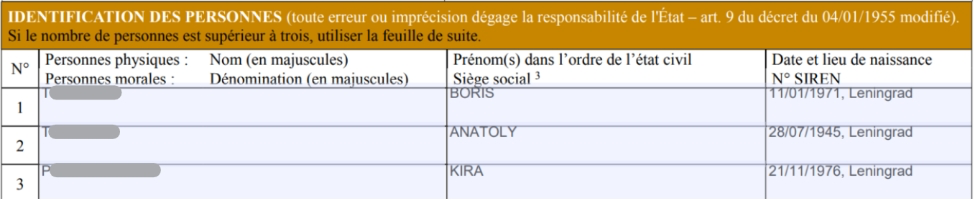 - IDENTIFICATION DES PERSONNES (Идентификация лиц). В этом разделе нужно привести данные героев вашего расследования. В столбце «Personnes physiques: Nom (en majuscules)» указать фамилию человека, а в столбце «Prénom (s) dans l’ordre de l’état civil» — его имя. В столбце «Date et lieu de naissance» — дату и место рождения. Если речь идет о юридическом лице, то в первом столбце указывается его наименование, во втором — юридический адрес, в третьем — номер SIREN.