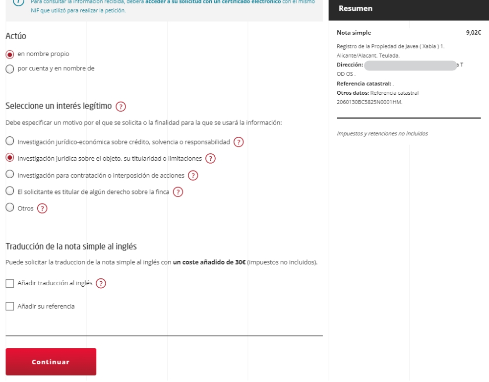 На следующем экране выбираем пункт, что действуем от своего имени («en nombre propio»), а также указываем причину заказа выписки. Я выбрал «Investigación jurídica sobre el objeto, su titularidad o limitaciones» (юридический анализ объекта, правообладателей и ограничений).