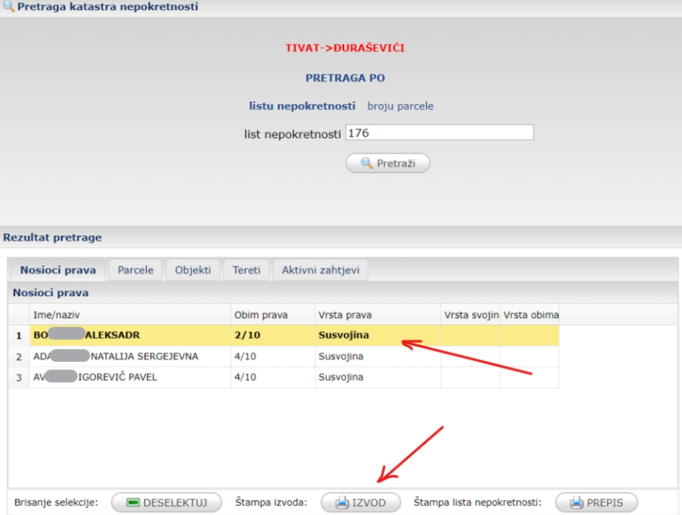 Если же мы выделим имя владельца недвижимости и нажмем кнопку «Izvod» или «Prepis», то получим информацию в форме документа, пригодного для публикации.
