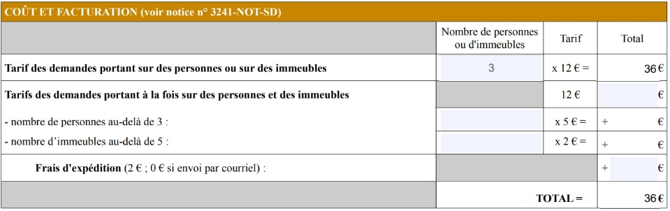 - Наконец, когда вы заполнили информацию о лицах, либо об объекте недвижимости, нужно заполнить финансовые данные. К примеру, мы искали информацию о трех персонах. После заполнения поля «Nombre de personnes ou d’immeubles» («Количество лиц или объектов недвижимости») расчет производится автоматически.