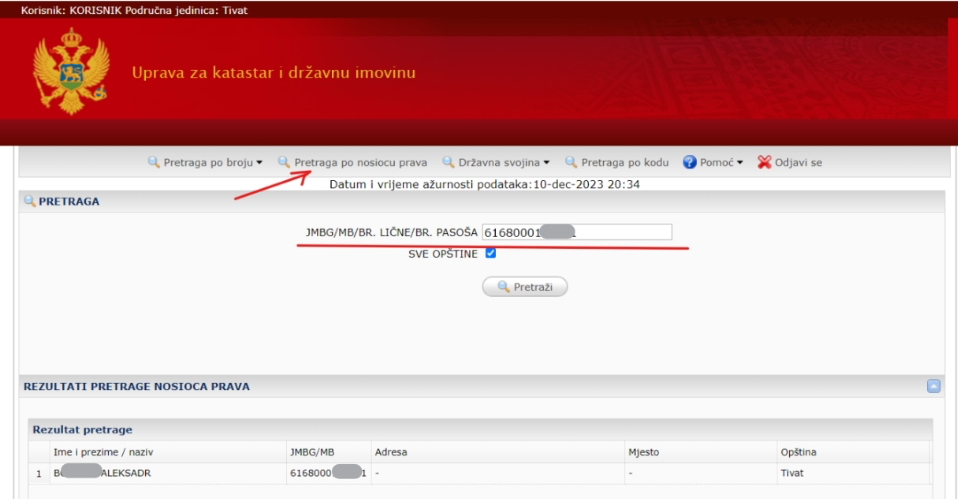 Также реестр позволяет осуществлять поиск по правообладателю, но для этого нужно знать JMBG (уникальный идентификационный номер гражданина), Matični Broj (регистрационный номер), Broj Lične Karte (номер удостоверения личности гражданина) или Broj Pasoša (номер заграничного паспорта).