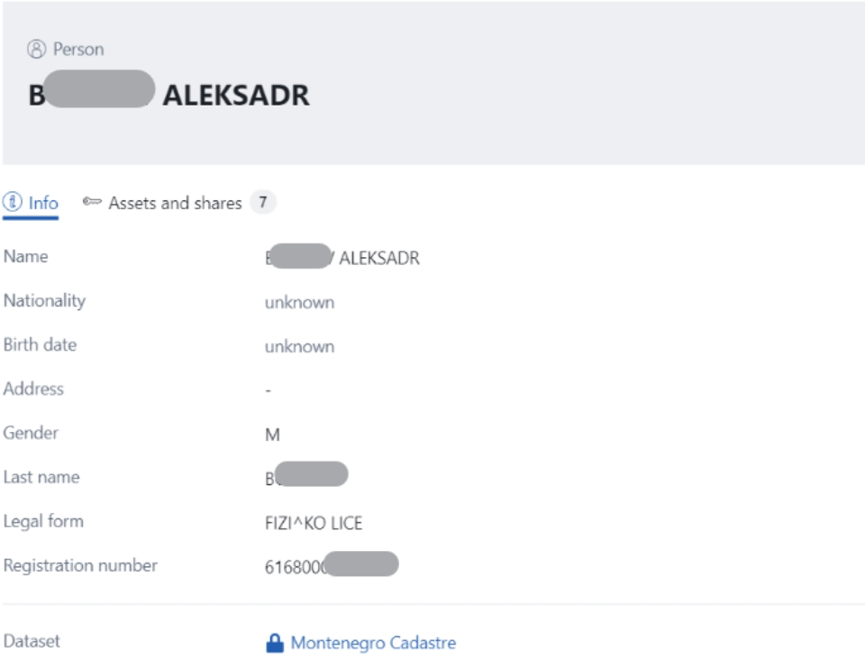 Найти такой номер, как и всю информацию об объектах недвижимости, можно в спарсенном черногорском реестре, который имеется в Aleph (нужно предварительно запросить у OCCRP доступ к этому реестру).