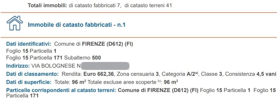 Строка Totali immobili означает общее количество недвижимости в выписке. В нашем случае лицу принадлежит 7 строений (fabbrica) и 41 участок (terreno), которые соответственно обозначаются знаками домика и дерева.
