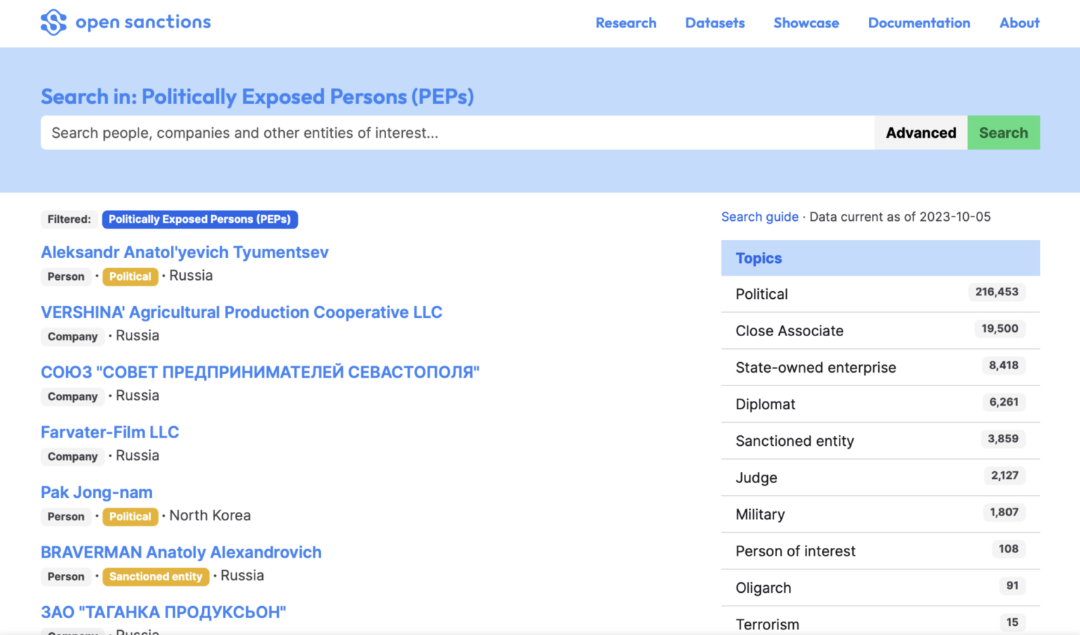 На сайте OpenSanctions можно найти регулярно обновляемый бесплатный список ПДЛ с функцией поиска. В этой базе данных содержится информация о 190 000 политиках, 28 000 приближённых к ним лицах, 120 лицах, связанных с терроризмом, и 5 лицах из категории «шпионы». Ещё один источник информации о ПДЛ — Wikidata, база знаний, которая отслеживает публичных должностных лиц по всему миру. Также можно обратиться к Списку российских миллиардеров Forbes 2023 года (на русском).
